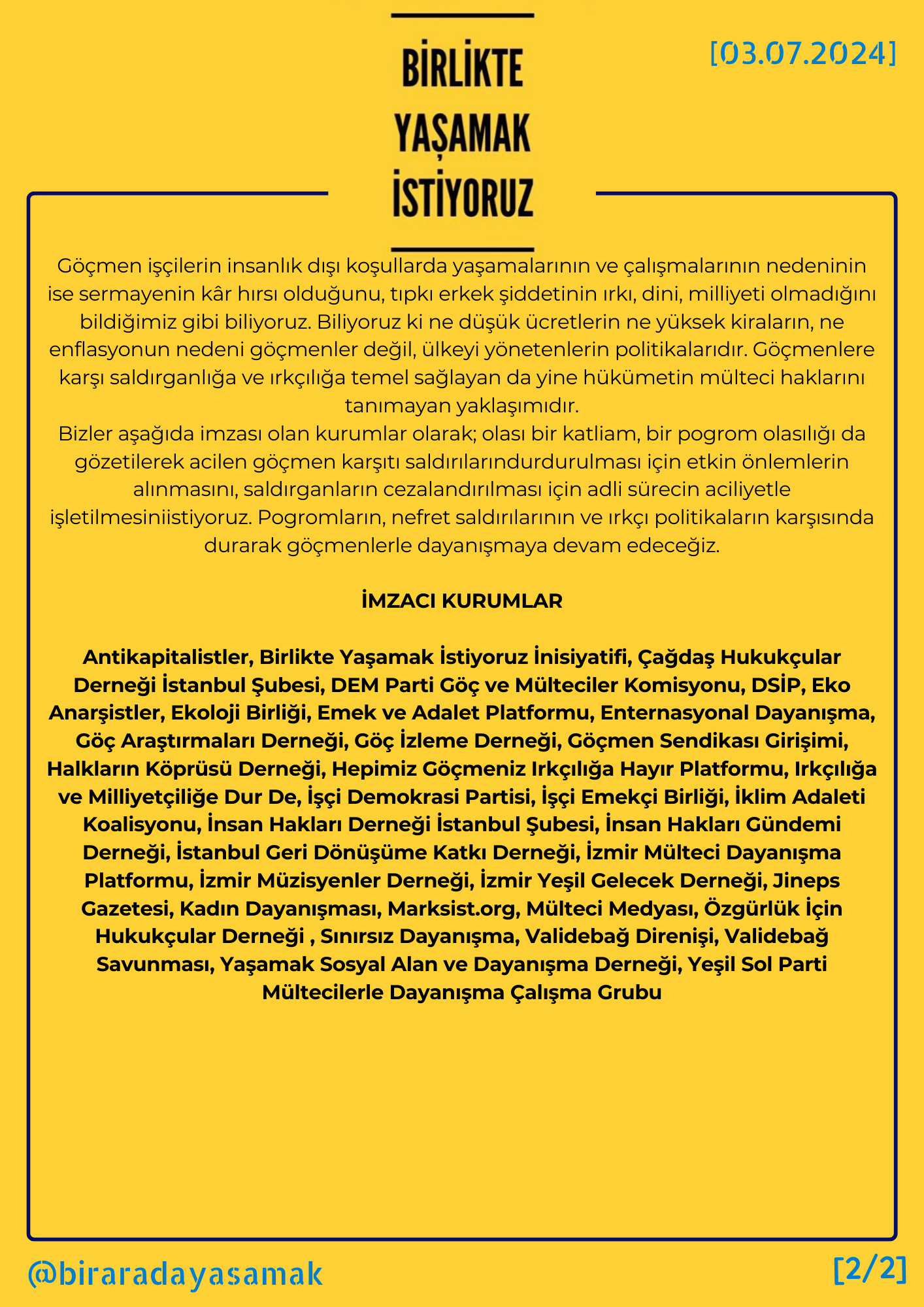 Bizler aşağıda imzası olan kurumlar olarak; olası bir katliam, bir pogrom olasılığı da gözetilerek acilen göçmen karşıtı saldırıların durdurulması için etkin önlemlerin alınmasını, saldırganların cezalandırılması için adli sürecin aciliyetle işletilmesini istiyoruz. Pogromların, nefret saldırılarının ve ırkçı politikaların karşısında durarak göçmenlerle dayanışmaya devam edeceğiz.